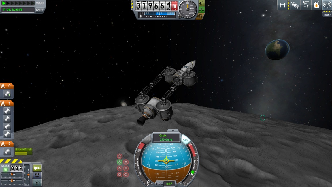 boni01: [^boni01] Po nieco, eee, chaotycznym starcie, całkiem spoko wyciągnął się na niską orbitę księżyca. No ale sensu w nim ni ma za bardzo. #kerbal |