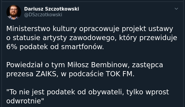 steev: Ja bym się i zgodził nawet na 10% podatku od smartfona... Pod warunkiem, że mógłbym wybrać do kogo ta kasa (nie) pójdzie. |
