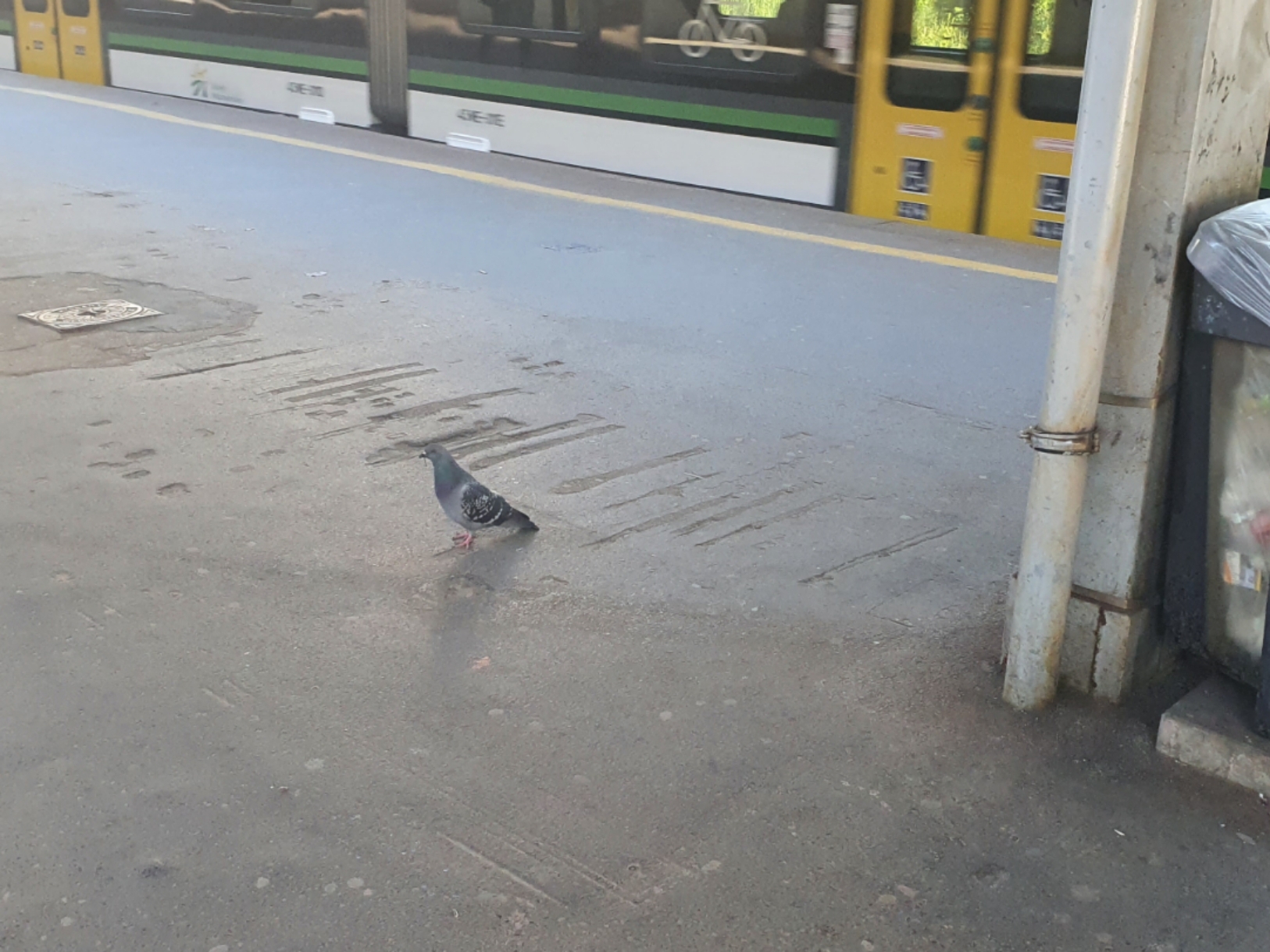 clea: Na peronie obok mnie stoi sobie gołąb z czymś w dziobie i wyraźnie czeka na pociąg. |