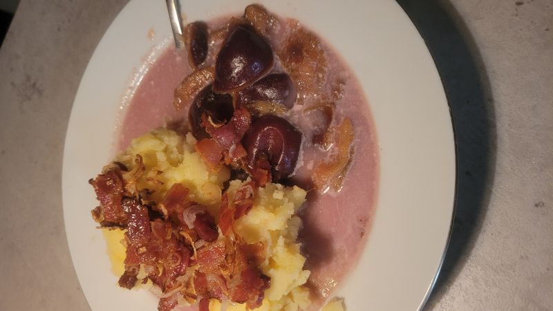 lupinka: zrobiłam dziś danie mojego dzieciństwa, bo już dawno opowiadałam o nim A., a jakoś nie pamiętałam, żeby wykonać. zabielana śmietaną zupa owocowa, kopczyk ziemniaków z omastą. |