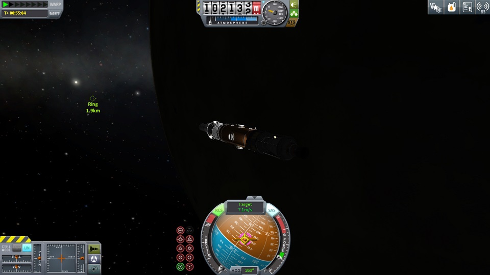 boni01: [^boni01] #kerbal Spokojnie se lecimy parę km - w międzyczasie przełączamy RCSy w tryb przesunięć, uczymy się jak pojazd reaguje na RCSy, trymujemy środek ciężkości, przelewamy paliwo, włączamy światła, przecieramy przednią szybę |