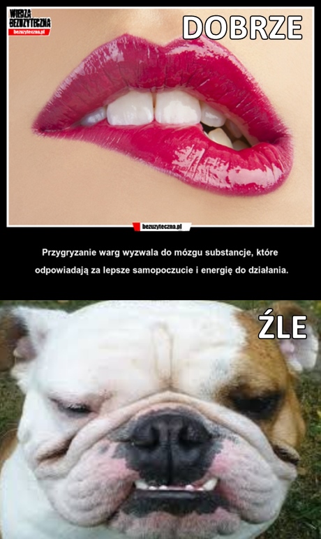kerri: [^qmack] co mi przypomina, jak J. mi wczoraj objaśniał, że przygryzanie wargi jest pociągające, tylko trzeba pamiętać, którą wargę przygryźć. |