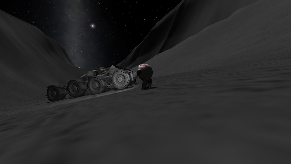 boni01: [^boni01] #kerbal seria obrotów (ale nie salt ;) przy 30-40m/s kosztowała pięć rozwalonych kół, urwanie podnośników. Ale przetrwał. A ponieważ się spodziewałe takich akcji, jedzie nim Inżynier - ponaprawiał i w drogę. |