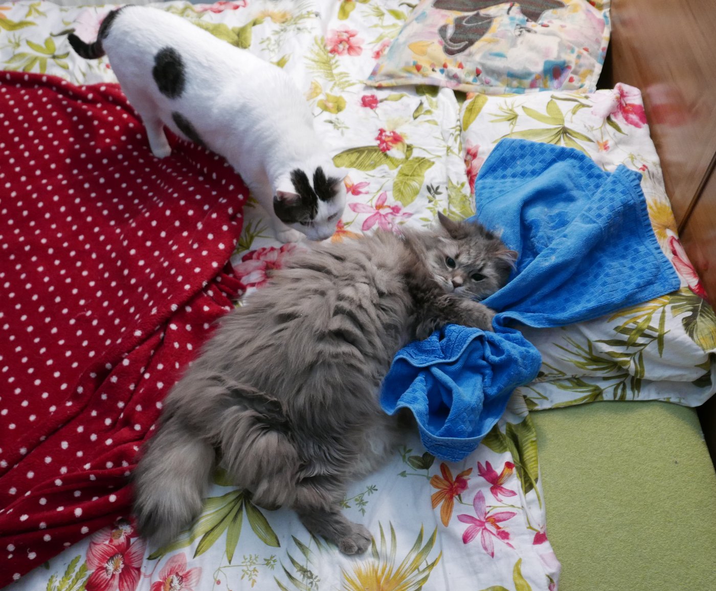 altair4: Kotecki ogarnięte. Cokolwiek zostawiam nowego to kot Kropka zachowuje się jak fetyszysta i się w tym tarza. Na zdjęciu jako ofiara występuje mój ręcznik na łóżku. W menu są też buty i plecak :D #kocianny #pokakota |