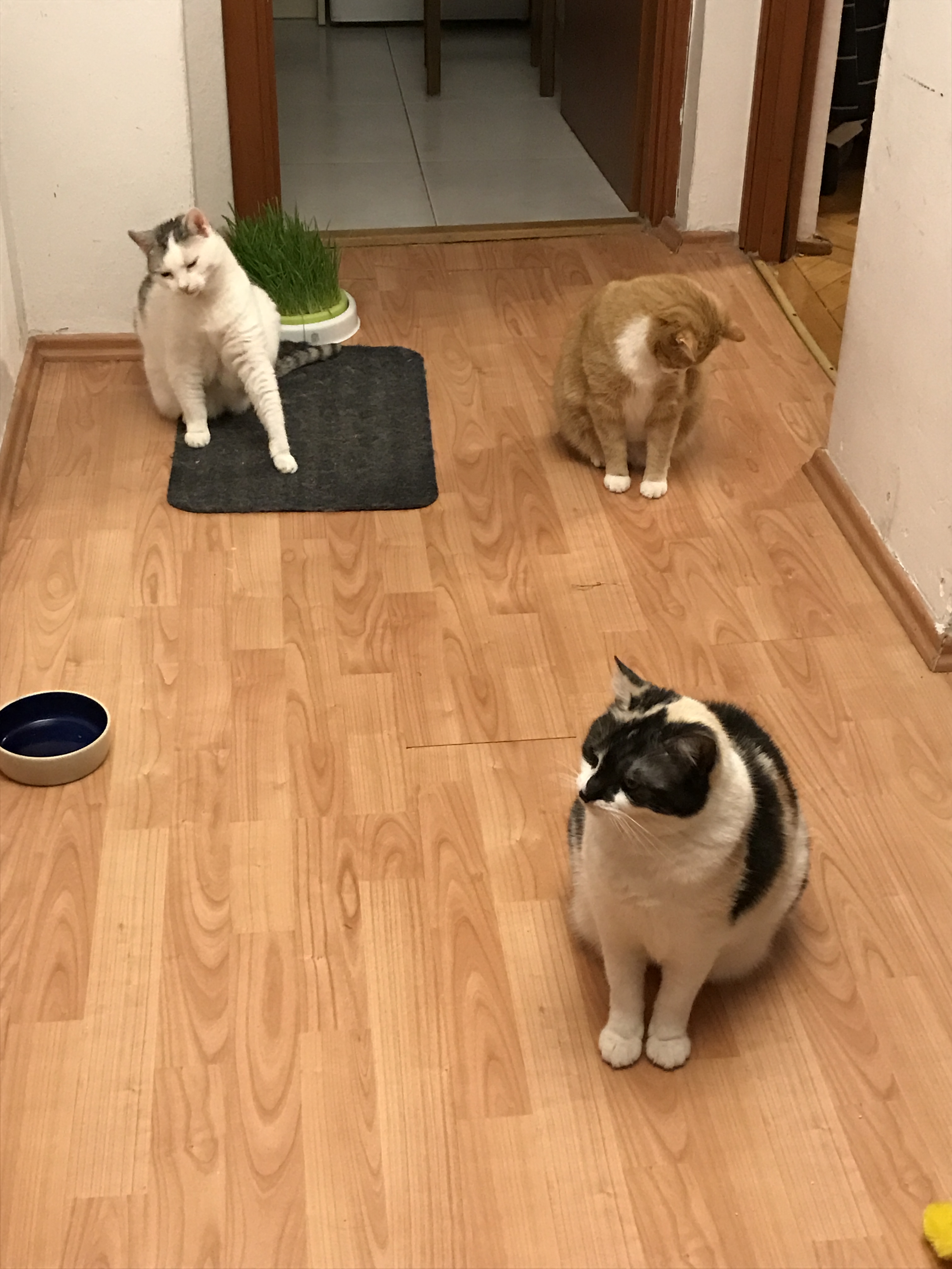 aniaklara: komitet powitalny: jedno się drapie, drugie ogląda własne łapki, trzecie patrzy w bok #pokakota |