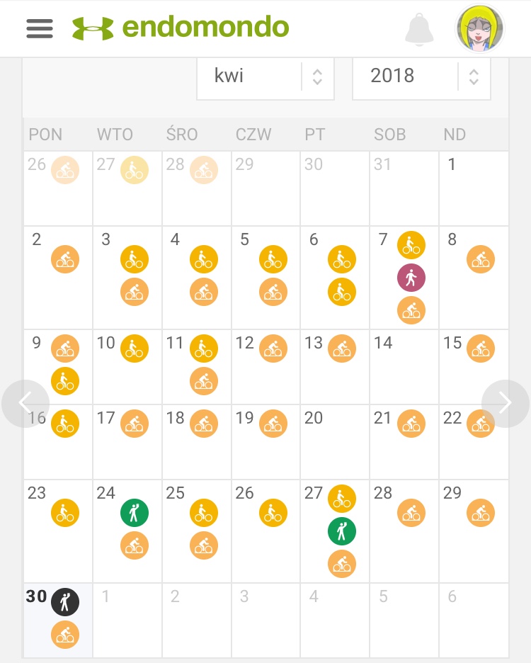 scarbossa: Jestem z siebie bardzo dumna, bądźcie dumni ze mną , w liczbach kwiecień wyglądał tak 310,68 km, a nie wszystkie treningi to km, 18h 2 minuty, 6121 kcal, brawo ja #dzielnascarbi |