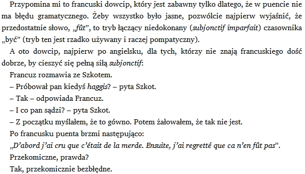 ^boni01: [^janekr] Tia, francuskie dowcipy o obcym jedzeniu, jeden z 3 naczelnych dowodów, że Monstroteratum Furiosum (Ohydek Szalej) potrafi fałszywie zawyżyć samoocenę we własnym stadzie wzg. innych stad do poziomów zupełnie kosmicznych. 2018/12/13 10:45:22