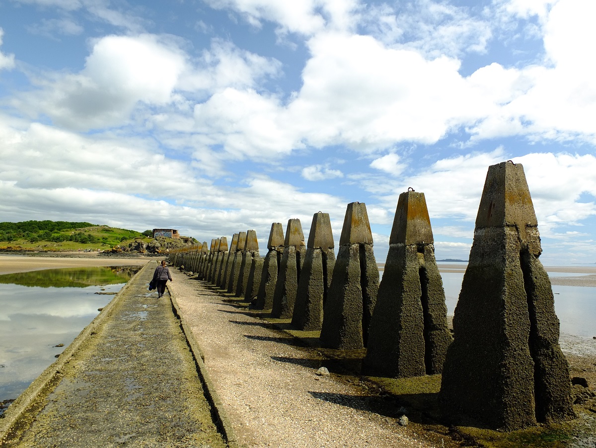 [^boni01] Grobla do Cramond Island i bariera przeciwokrętowa z bliska; bloki mają ze 3m. Na wprost posterunek obserwacyjny na skałach, "od strony lądu". #bofoto |