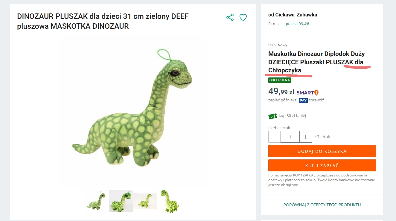 #Kumkwat lekko zrzędzi o maskotkę i ma świra na punkcie diplodoków, więc niezobowiązująco zapytałam Allegro w temacie. I dobrze, że niezobowiązująco, bo jak tu kupić dziewczynce taką zabawkę.