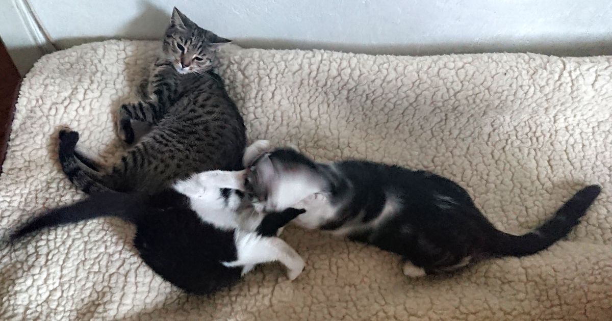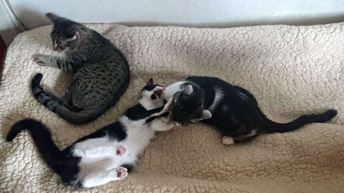 [^wiq] Nadal nie ma. Natomiast #Gniewko bawi się z #Mruczynka, a #Mysiek ściga #Mysia. Galop galop galop.