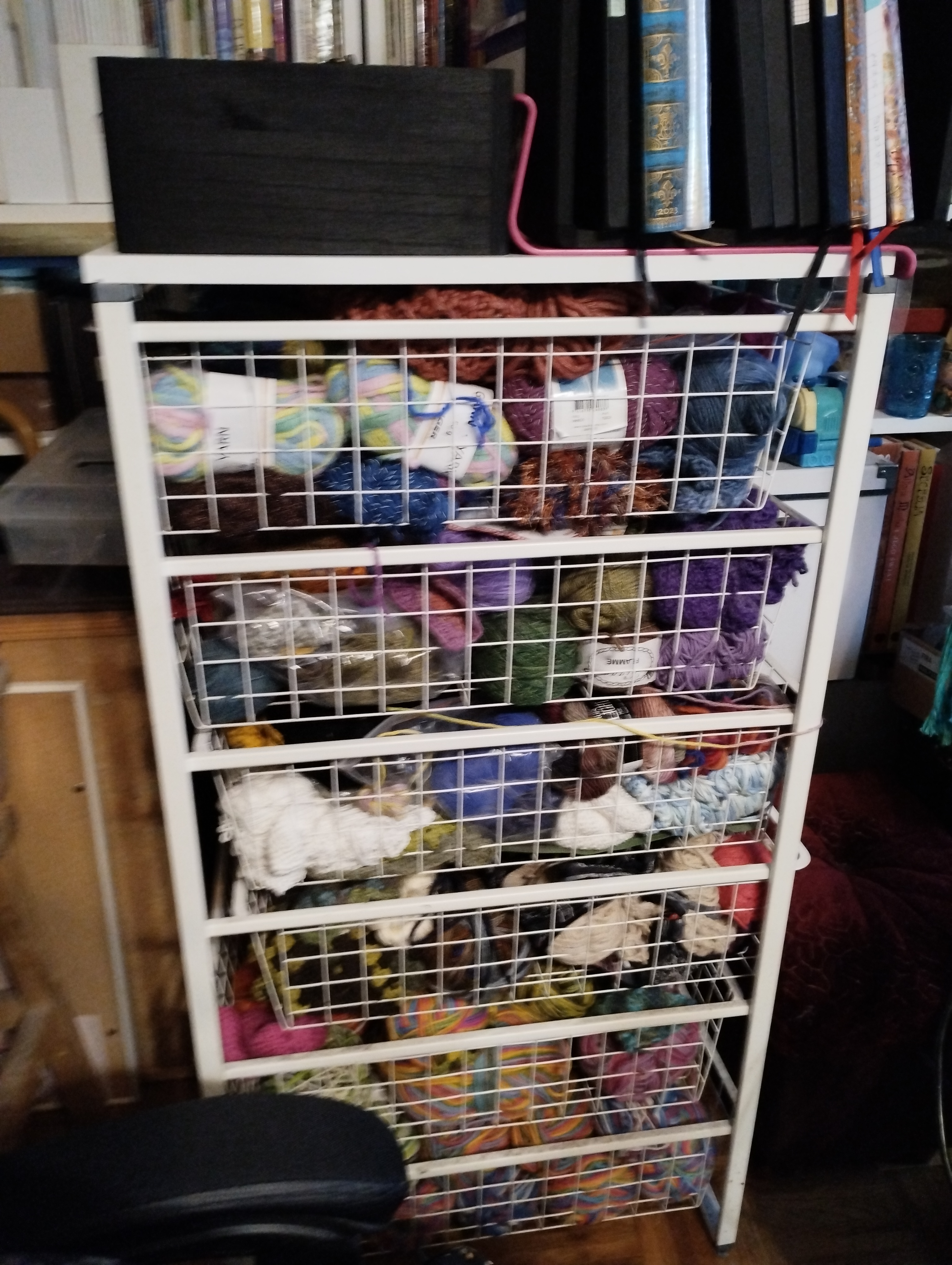 srebrna: [^srebrna] #deburdelizacja Między nimi jest regał pełen kolorowanek, książek robótkowych i rzeczy do szycia;) a włóczka jest jeszcze w tych trzech pudłach na górze (czerwone, czarne i w kotki) oraz torbach na dole pod nimi. |