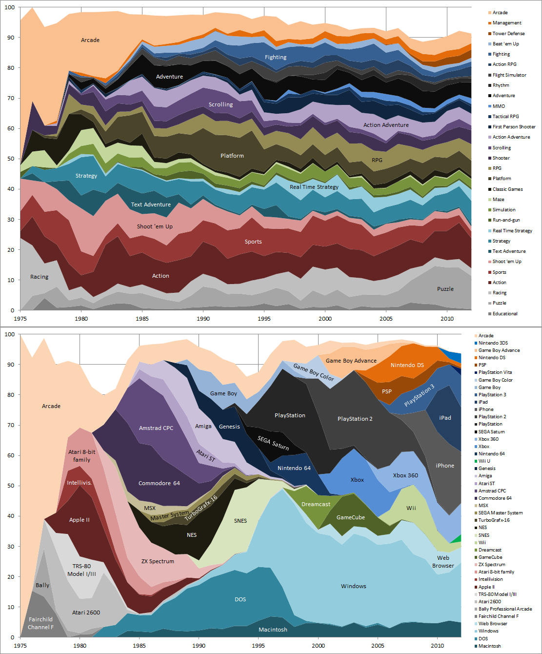 Udział gatunków gier i platform w ogólnej liczbie gier na przestrzeni lat. #