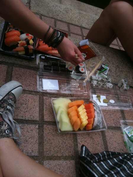 evilconcarne: W skandalicznych warunkach, na ziemi, otoczeni przez zolwie, zjedlismy sushi i dragonfruita z melonem na późne śniadanie. #hkg |