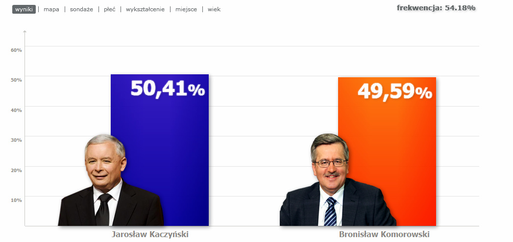 #Wybory #Komorowski 49.59% #Kaczyński 50.41% z 51,5% frekwencja 54%