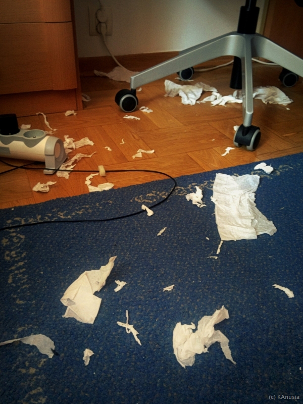 kanusia: Wpuścić #kanczylek na 5 minut do pokoju, w którym są chusteczki higieniczne... I tak kilka razy dziennie od nie-wiem-ilu dni, wysoki sądzie. Przestaję widzieć sens sprzątania... (W sumie - niewielka cena za chwilę spokoju ;)) |