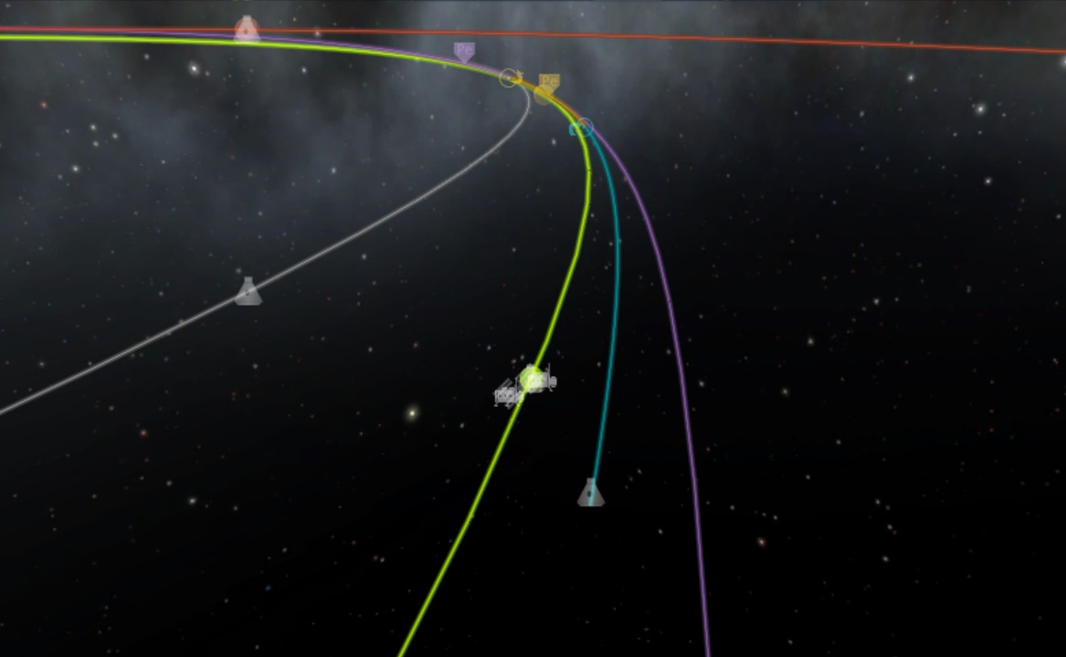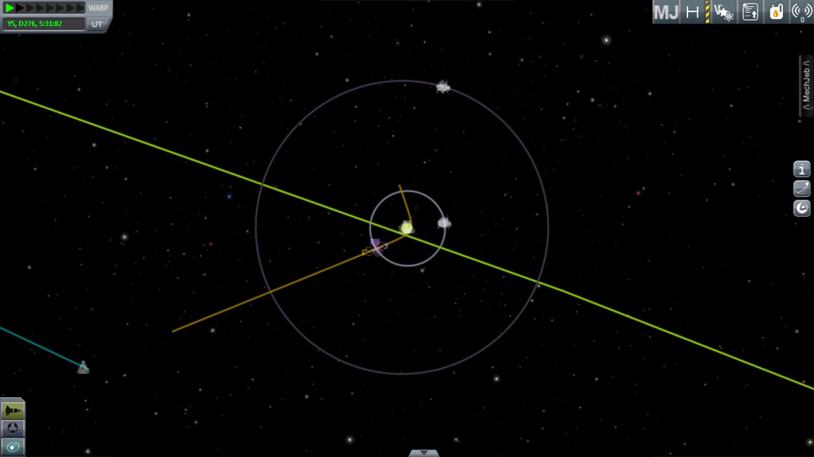 boni01: [^boni01] W sumie, kluczowe manewry tego samego dnia; marsjański właśnie wyrobił się na oparach na LKO parkingową, wenusjański (lewy dolny róg) już jest tak blisko, że skorygowałem dokładnie w LKO (plus zbędna asysta księżyca) #kerbal |
