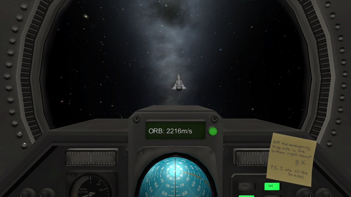 boni01: [^boni01] Teraz trza pozbierać coś koło 8 kerbalków i wrócić na ziemię. Nie chce mi się dokować wahadłowca, więc przesiadka 5 z Eve/Wenus "wpław", ale tylko 50m; stąd ładne ujęcie wahadłowca na wprost kabiny krążownika. #kerbal |