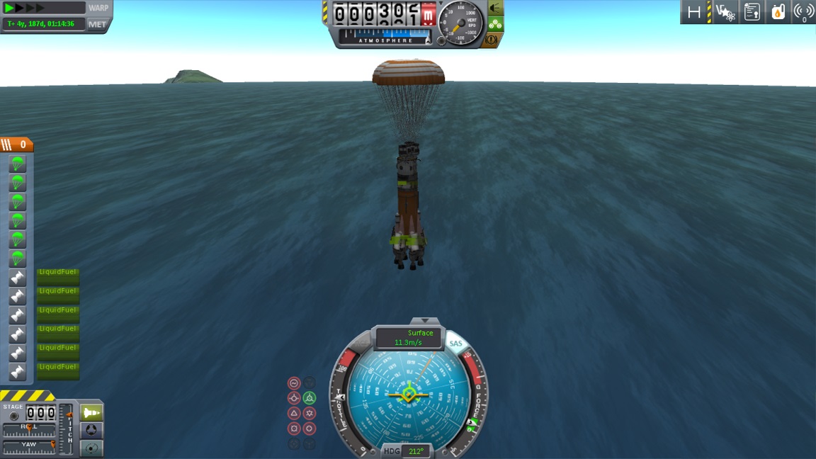 boni01: [^boni01] od czego mamy "haki" w #kerbal - nawbijałem w ciężki nieaerodynamiczny pojazd spadochronów i zleciałem z orbity, celując w wodę i w miarę łagodną trajektorię (chociaż mi wisiało, czy pół szrota się spali czy nie) |