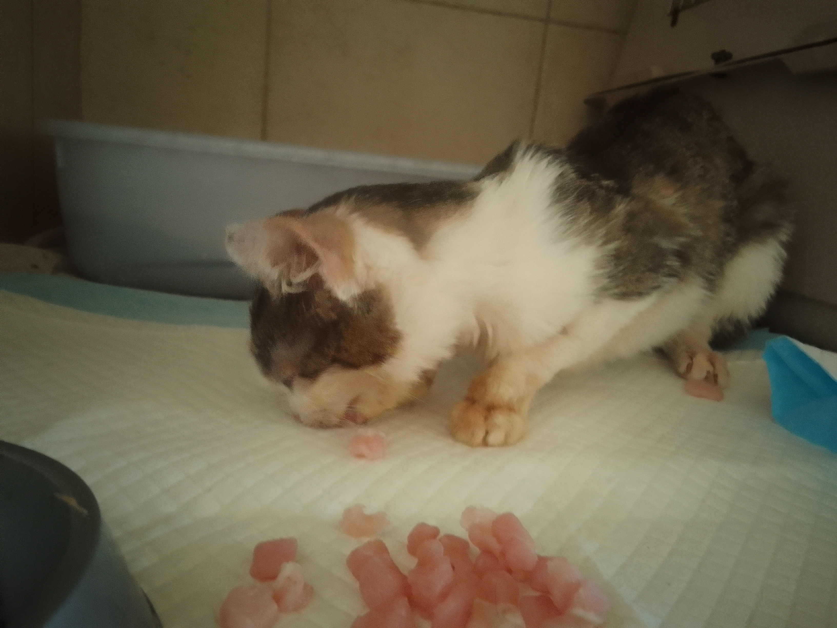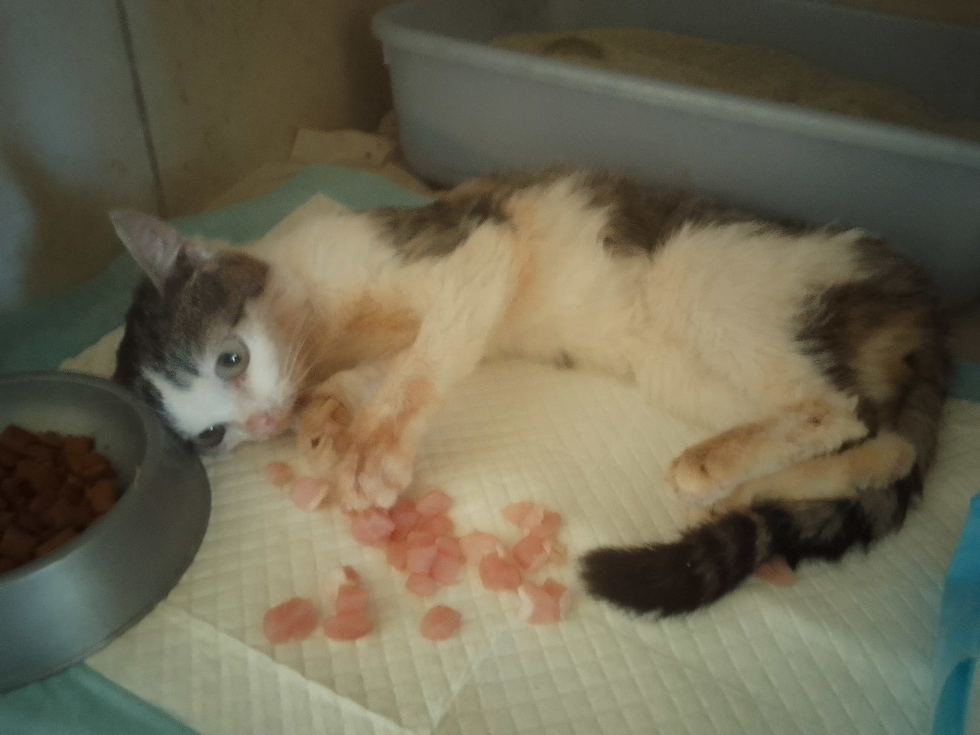 malalai: [^malalai] a poza tym wszystko bez zmian. Je z trudem, łepek jej wpada do miski, nosem w jedzenie, bo nie ma siły utrzymać głowy i gryźć jednocześnie (stąd porozrzucane mięsko, żeby mogła dziabnac leżąc) #kiciaTori #pokakota |