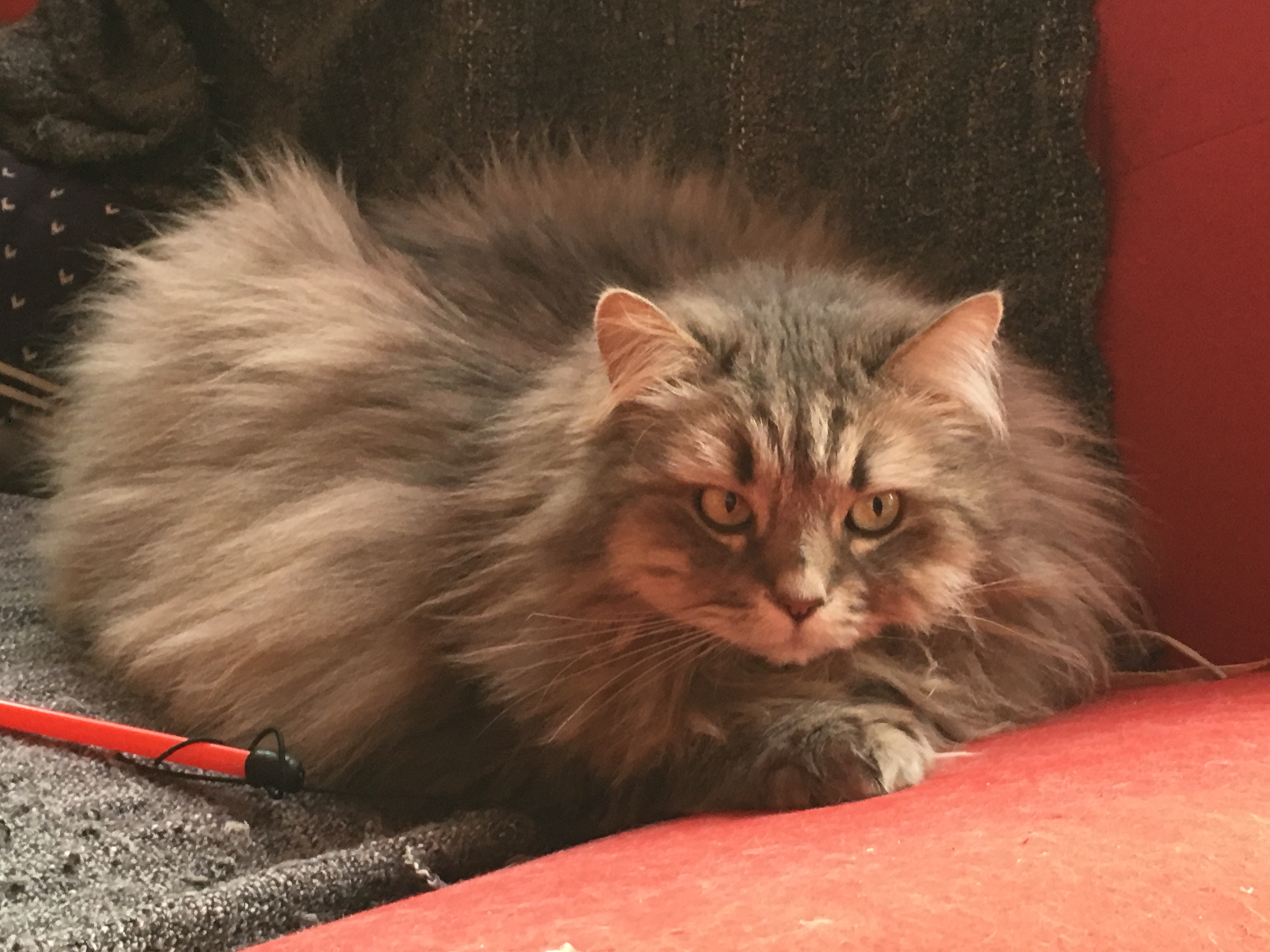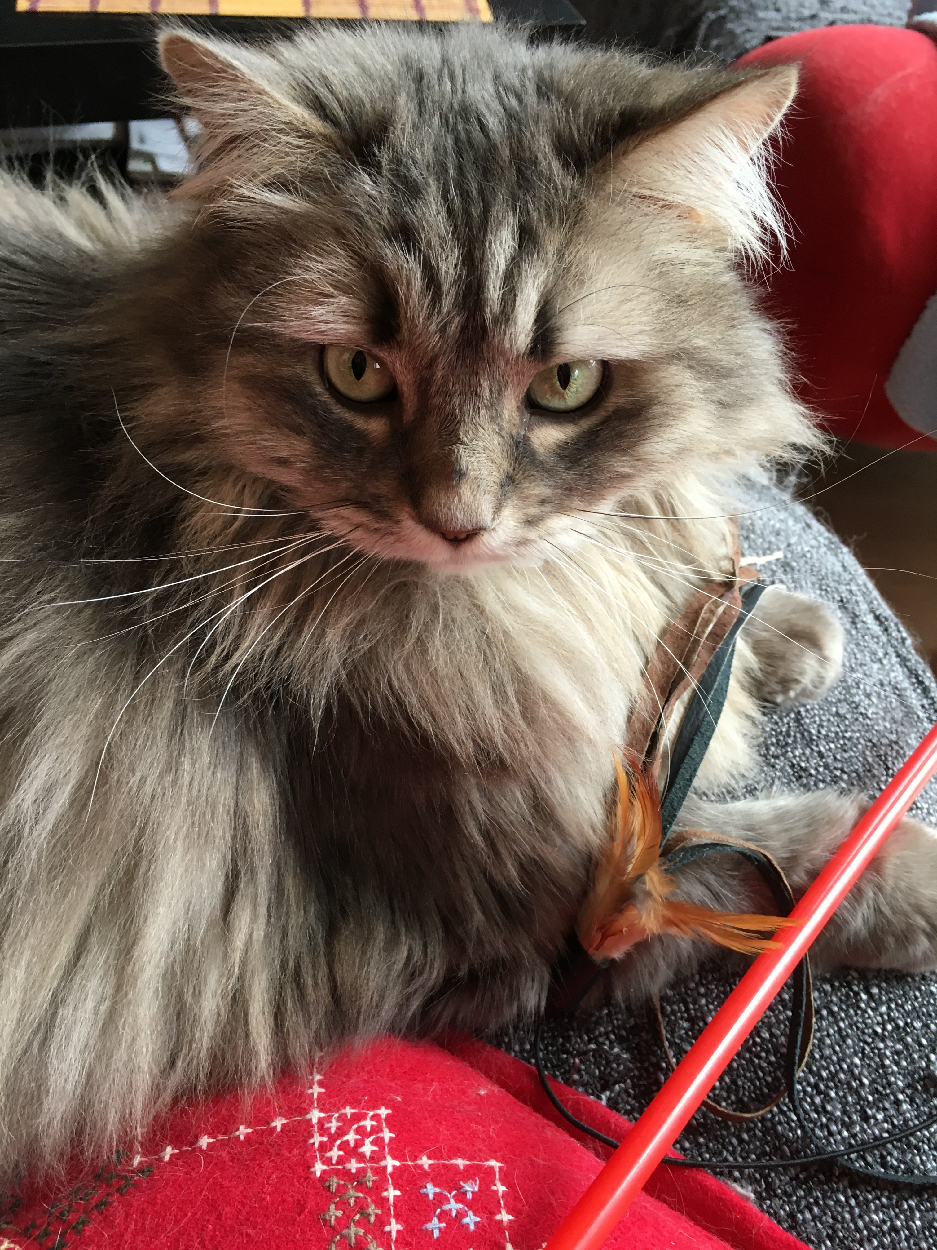 miss Kropka, wielka myśliwa: cudownie igrała ze mną wędką z piórkami, po czym chwyciła zdobycz, okopała się na sofie i w trymiga pozbawiła ją piórek #kocianny #pokakota