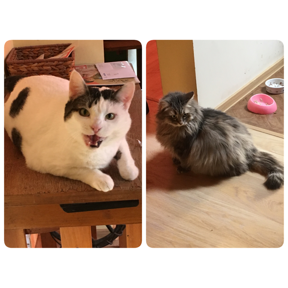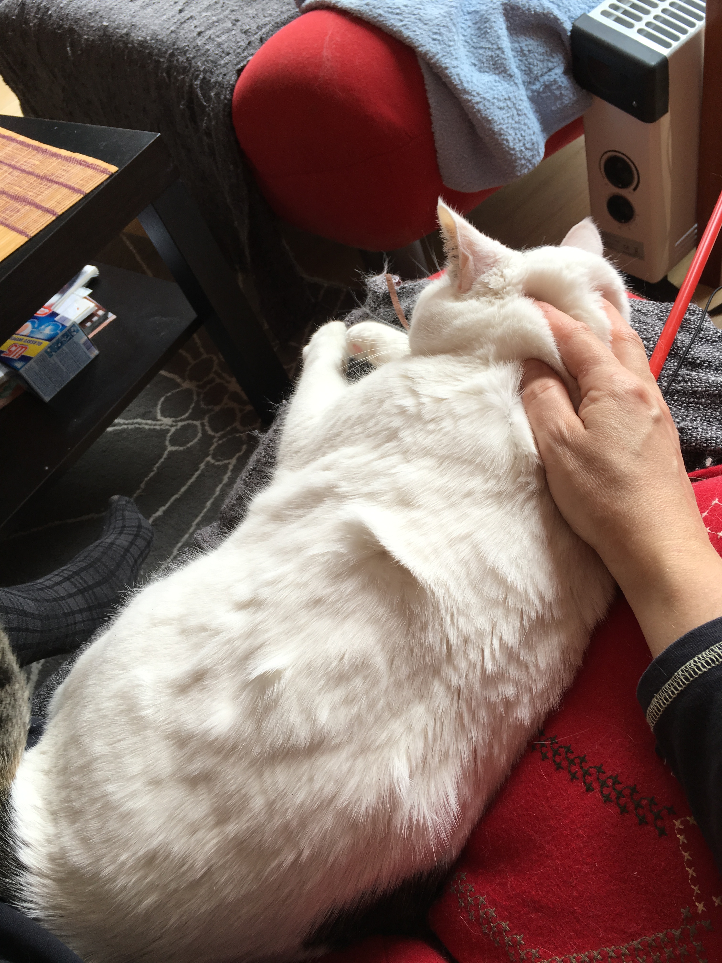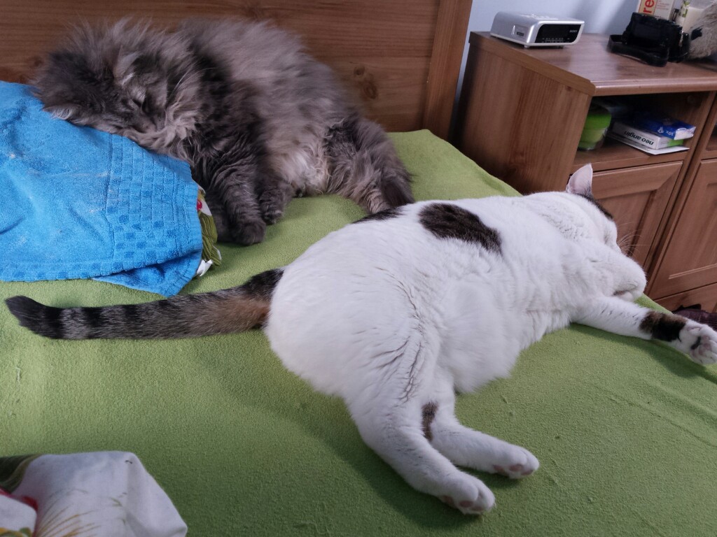 Aktualnie jest tak. Niespożyty zapał kota Kreski do bycia głaskanym. Kropka zaś śpi zmęczona, wcześniej parę razy nawet puściła się galopem za wędką ;) #kocianny #pokakota