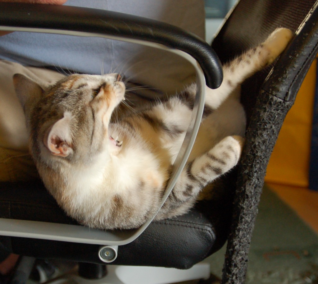 Przepycham się z #kot na fotelu. Kot jedzie zapieraczką od oparcia, ja wykorzystuję przewagę masy.
