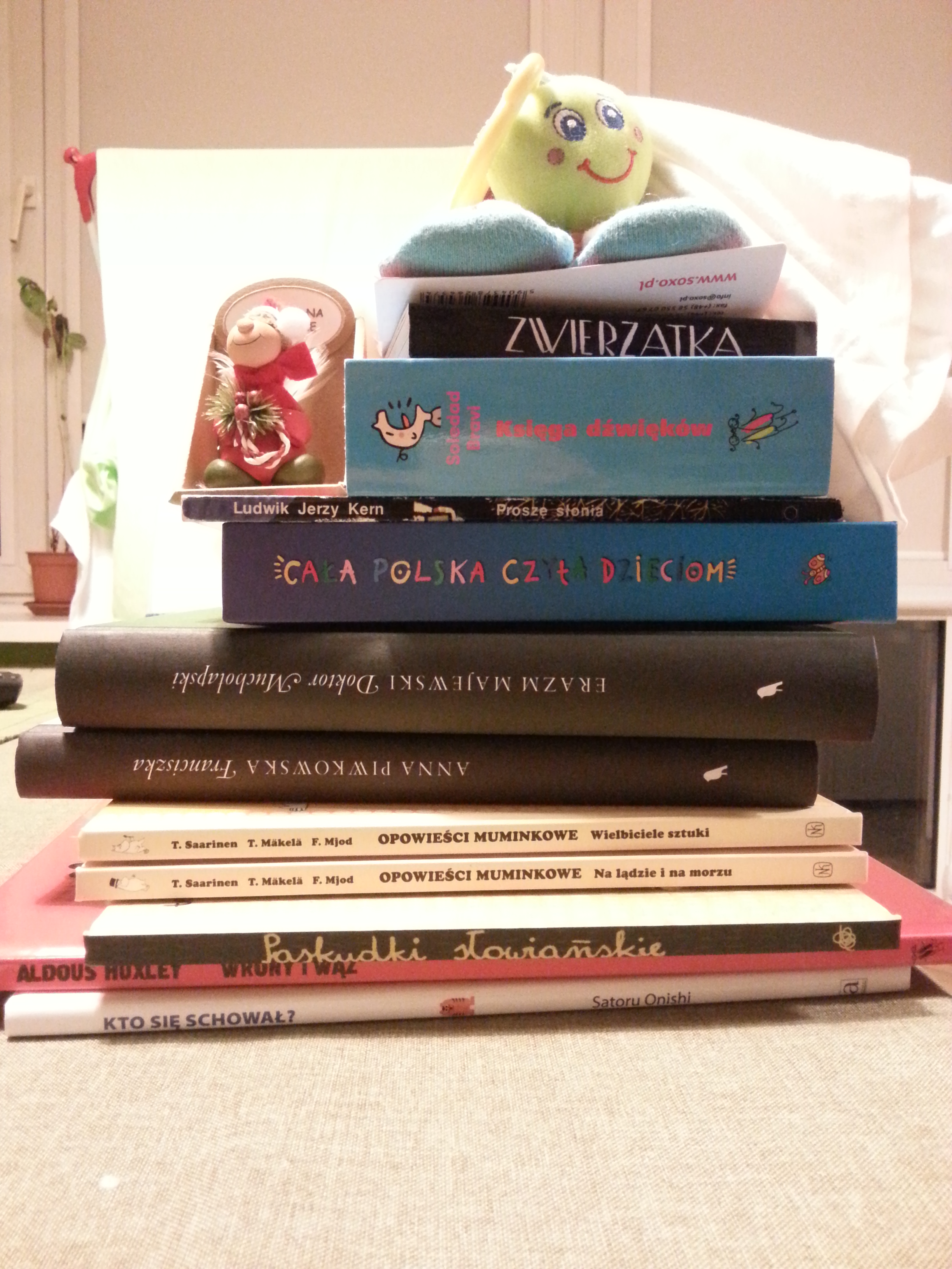 erwen: Oraz #Kumkwat dostała prezenty. Grzechotka od mamy, buciki od dziadka, aniołek od babci i... No, wszyscy kupiliśmy dziecku kilka książek na teraz i na wyrost. Tylko parę. |