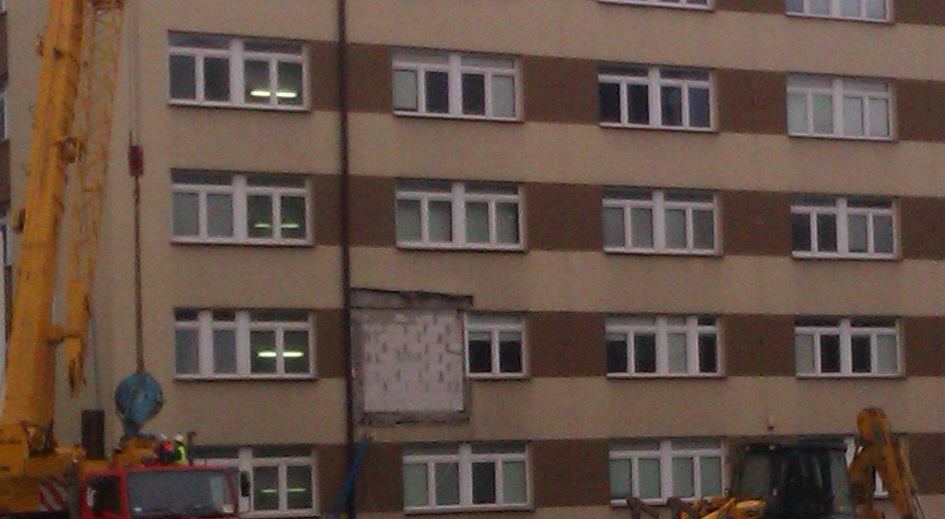 [^janekr] W budynku naprzeciwko #MIMUW kiepsko opatrzony kikut po łączniku z budynkiem, który zburzono.