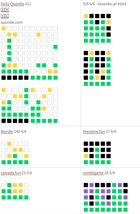 dziś wszystkie, chociaż słowoku to chyba pogrzało z tym pierwszym słowem. Oraz quordle mi się bardzo.