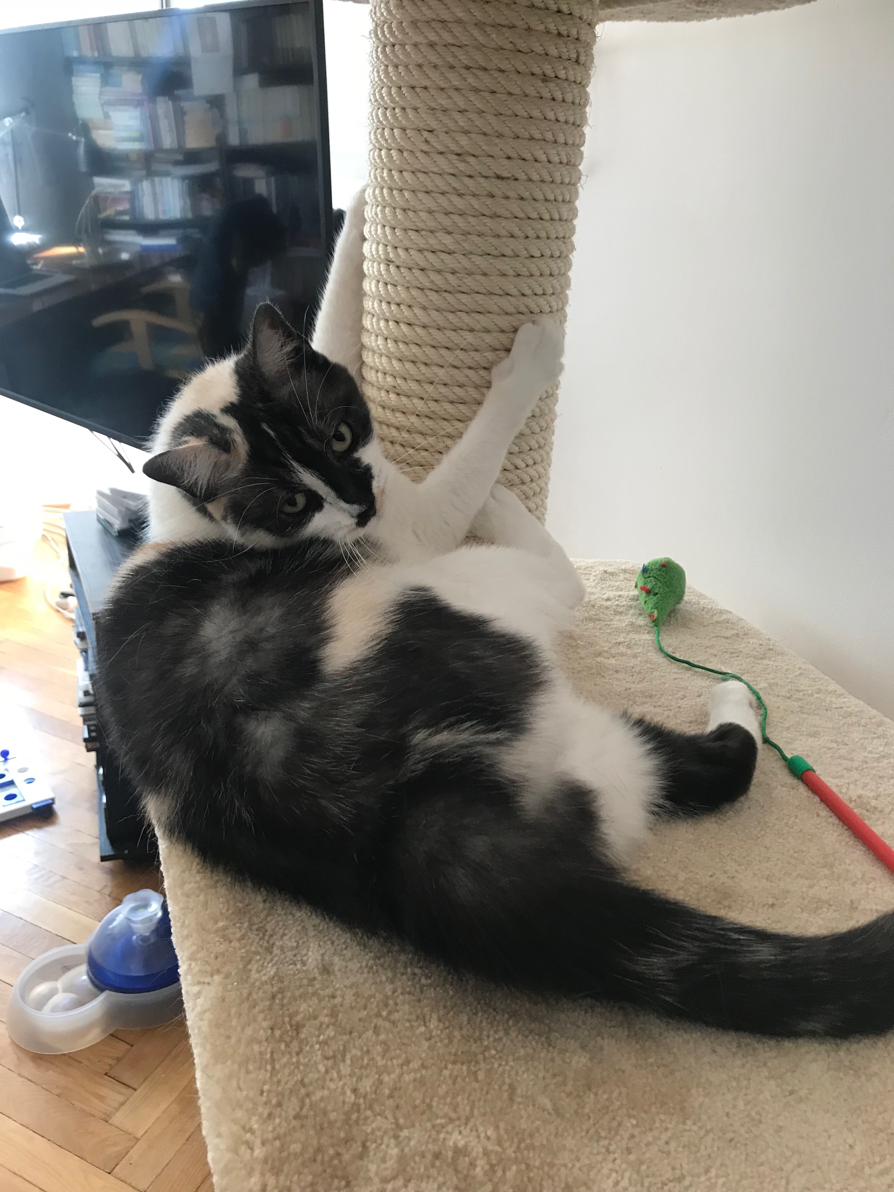 co jakiś czas widzę #nowamała Chihiro na półce drapaka, ale nie widzę, jak tam wchodzi: odbicie z podłogi? czy przesmykuje się jakoś z wierzchu budki?
