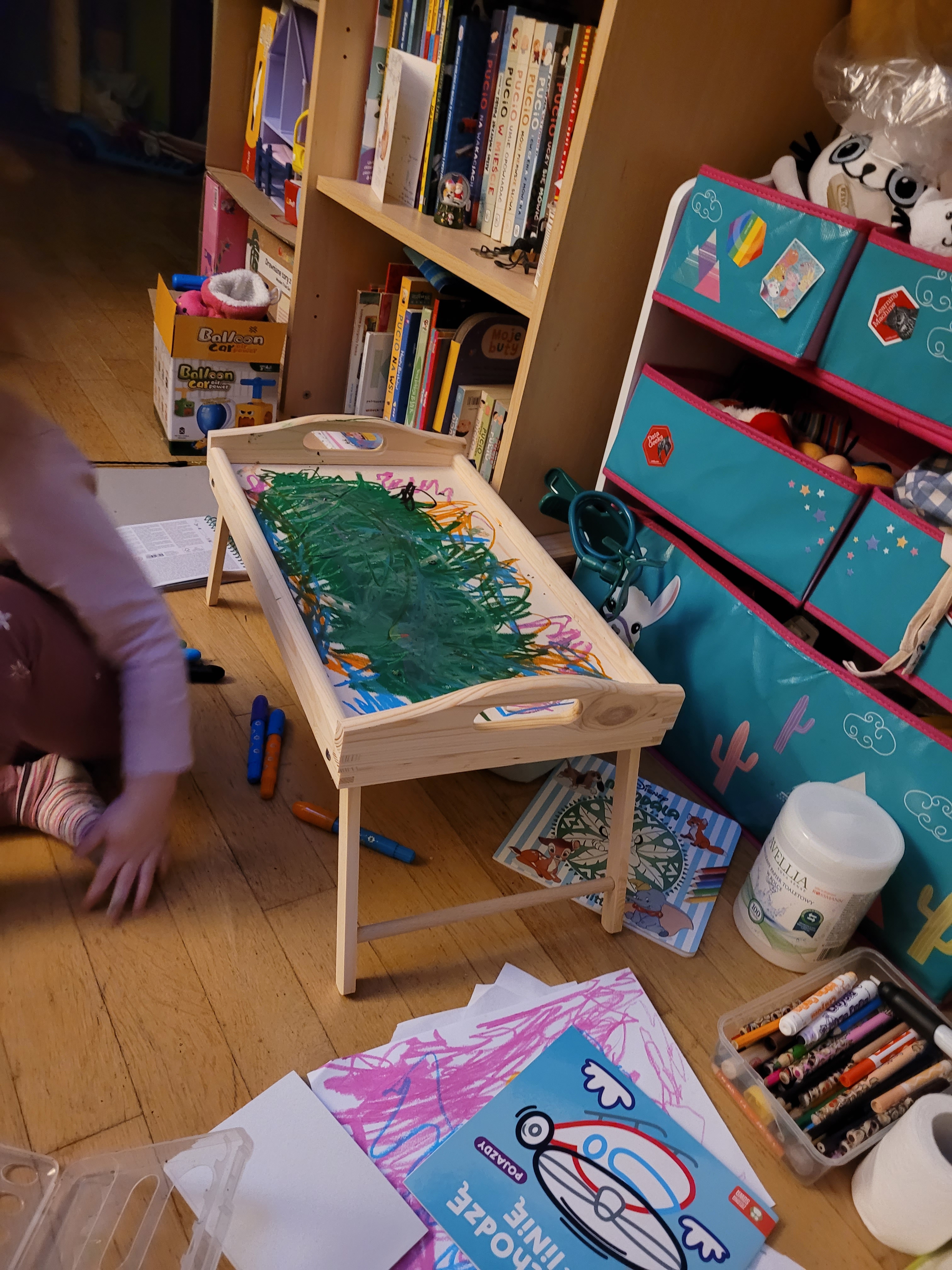 ^fel, #Okrushek to dopiero ma mocną kredkę. Na nowym, jeszcze nie polakierowanym stoliku. Ciekawe czy lakier przykryje silikonowe kredki