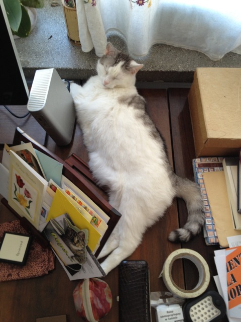 #pokabiurko taśma klejąca, dysk zewnętrzny, podstawka na książki, kot, pudełka i papiery...