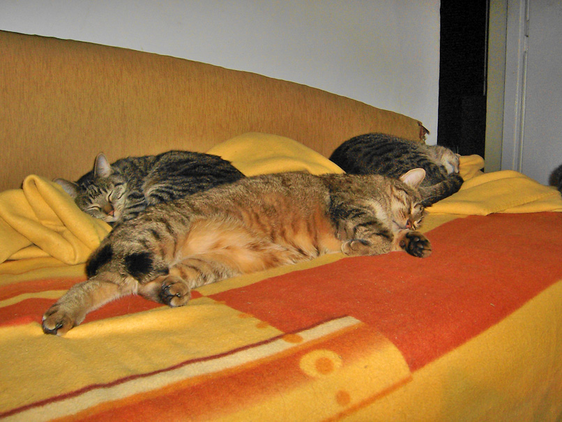 koleja porcja moich kociastych: duszek, barnaba (ten wyciagniety na cala dlugosc) i pusia (na samym koncu, mama duszka) #