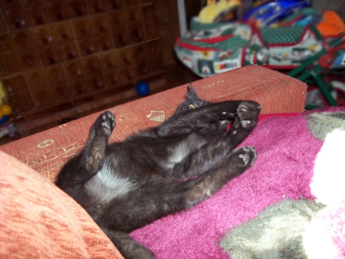 A kot leży w takiej śmiesznej pozycji i mruczy.#