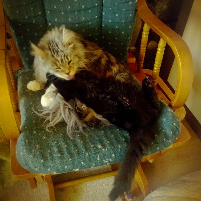 tygryziolek: Prawdziwy skok do przodu! VaiPerek wreszcie się przełamał i przytulił Czarną Tyldę. Potem co prawda trochę się pobiły, bo mała jest zaczepna i nie daje się tak od razu stłamsić, ale nadal leżą na jednym fotelu. #pokakota |