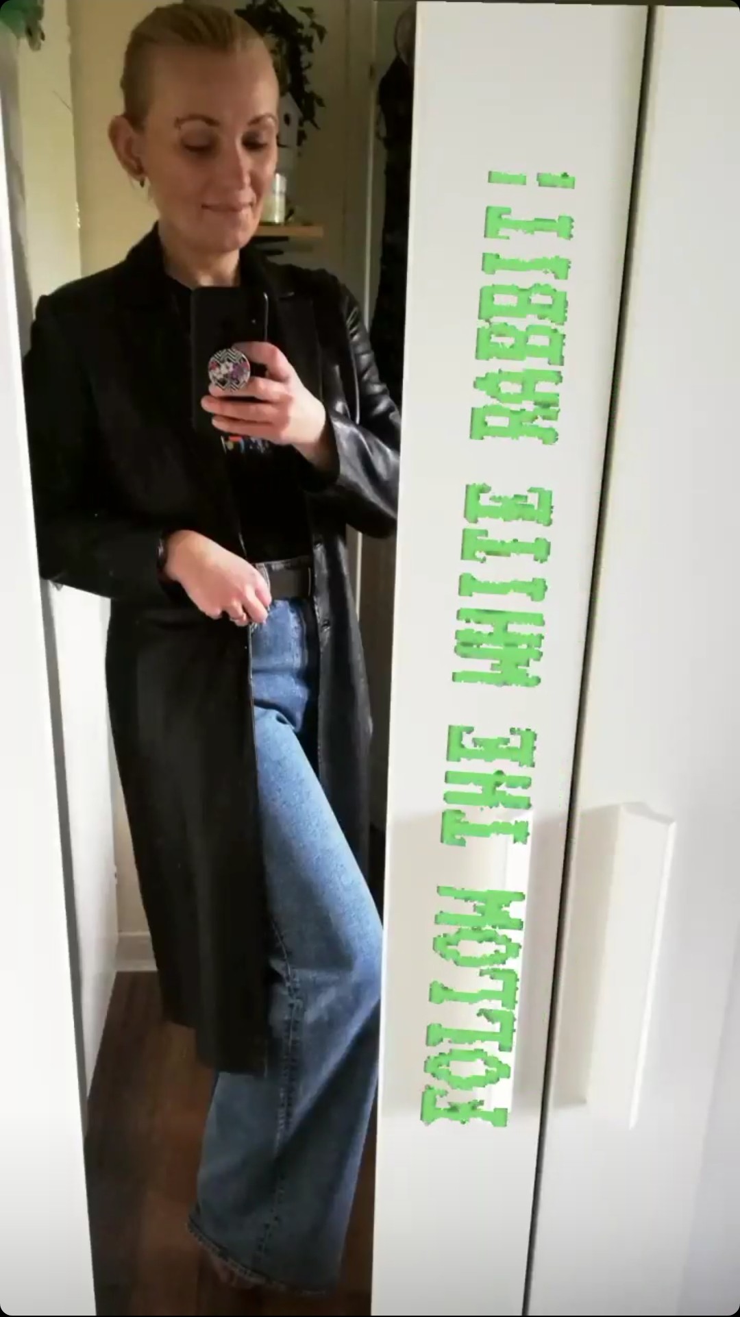 Kto ma dwie ręce, dżinowe dzwony z bardzo wysokim stanem i właśnie przypomniał sobie ze ma płaszczyk dziecka Neo :D #pokanenufa