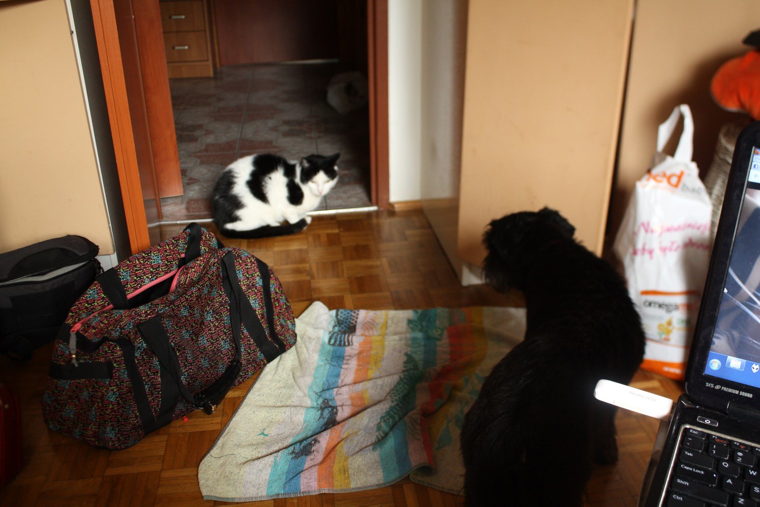 Pani wróciła ze spaceru z psem. Koty czekały. #