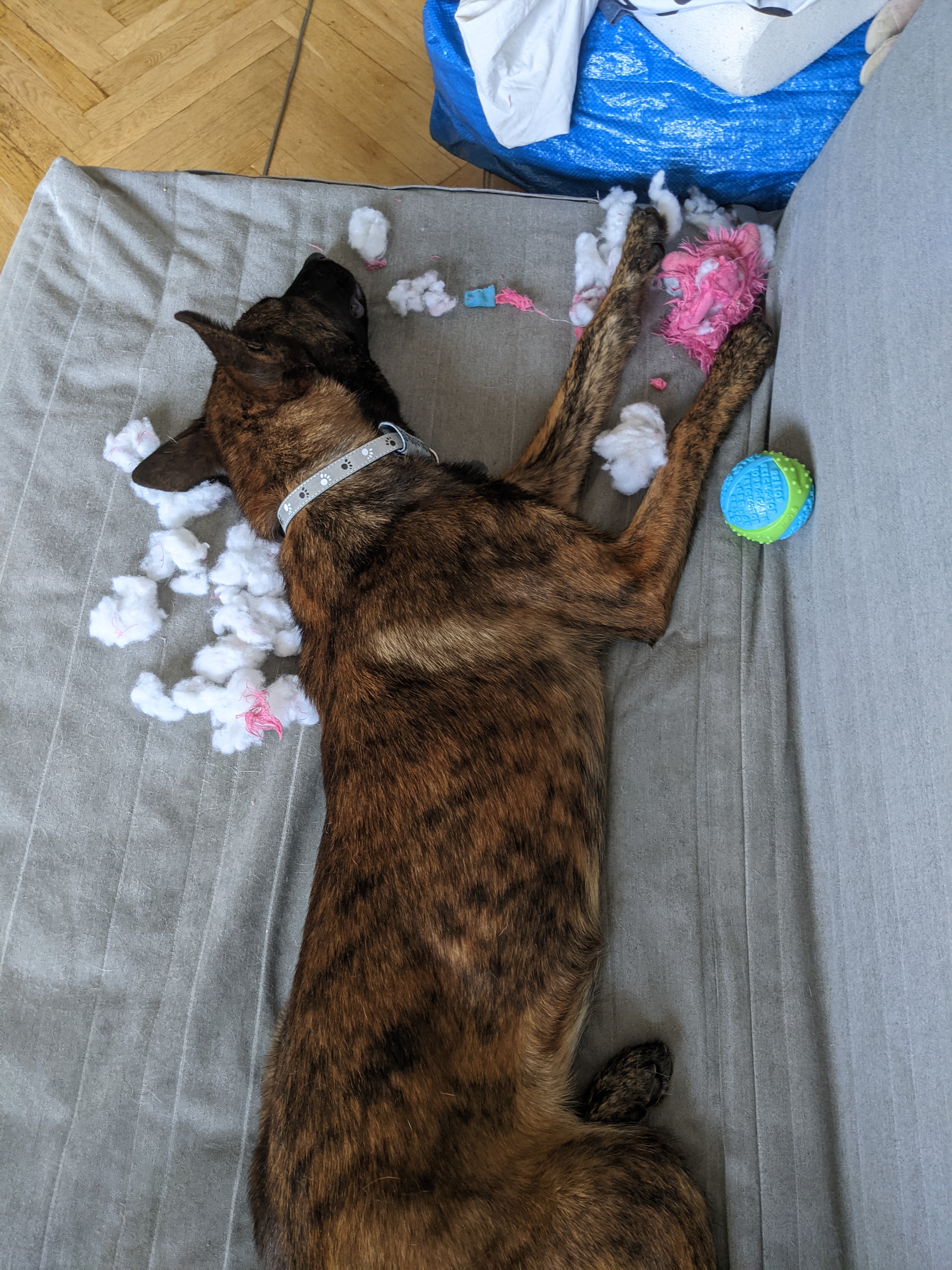 umęczonego (młody wesoło rozbraja pluszaka na kanapie)