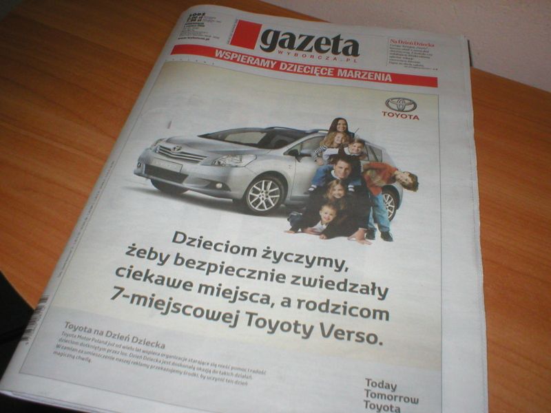 #pr 1 czerwca (dzień dziecka). Kto jest dla Gazety na pierwszym miejscu (stronie)? 4stronicowa okładka z reklamą Toyoty (odnotowane: 49 dzieci pojedzie na obóz)