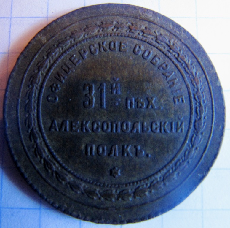 Żeton kasyna oficerskiego 31 aleksiejewskiego pp (garnizony: Pułtusk, Skierniewice) [www.sobiratel.net] #retrofotorus