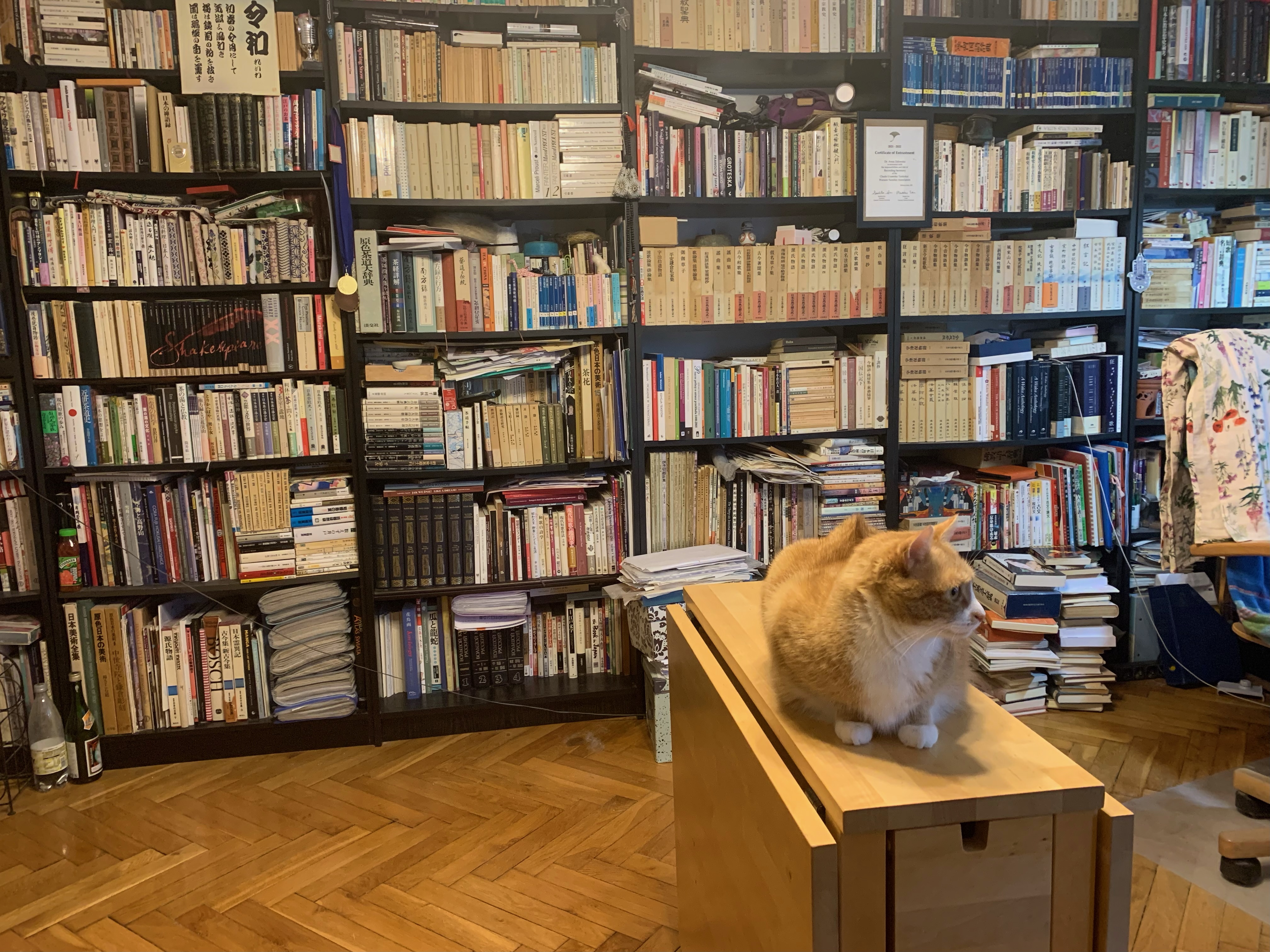 przygotowujemy się do konferencji: żeby mieć ładne tło z książek za głową, robię przemeblowanie #