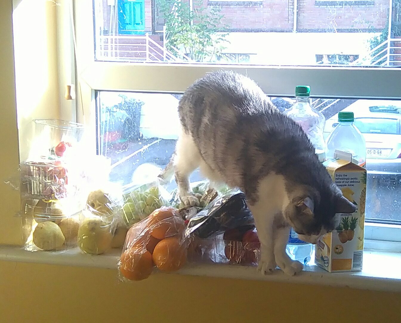 wskoczył na okno w złym miejscu i trochę utknął w moich zapasach owoców. #