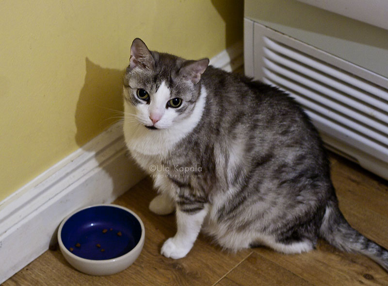 najpierw poprzyglądał się z krzesła a następnie usiadł przy swojej misce w pozie oczekiwawczej. Pełnej chrupek misce, dodam.