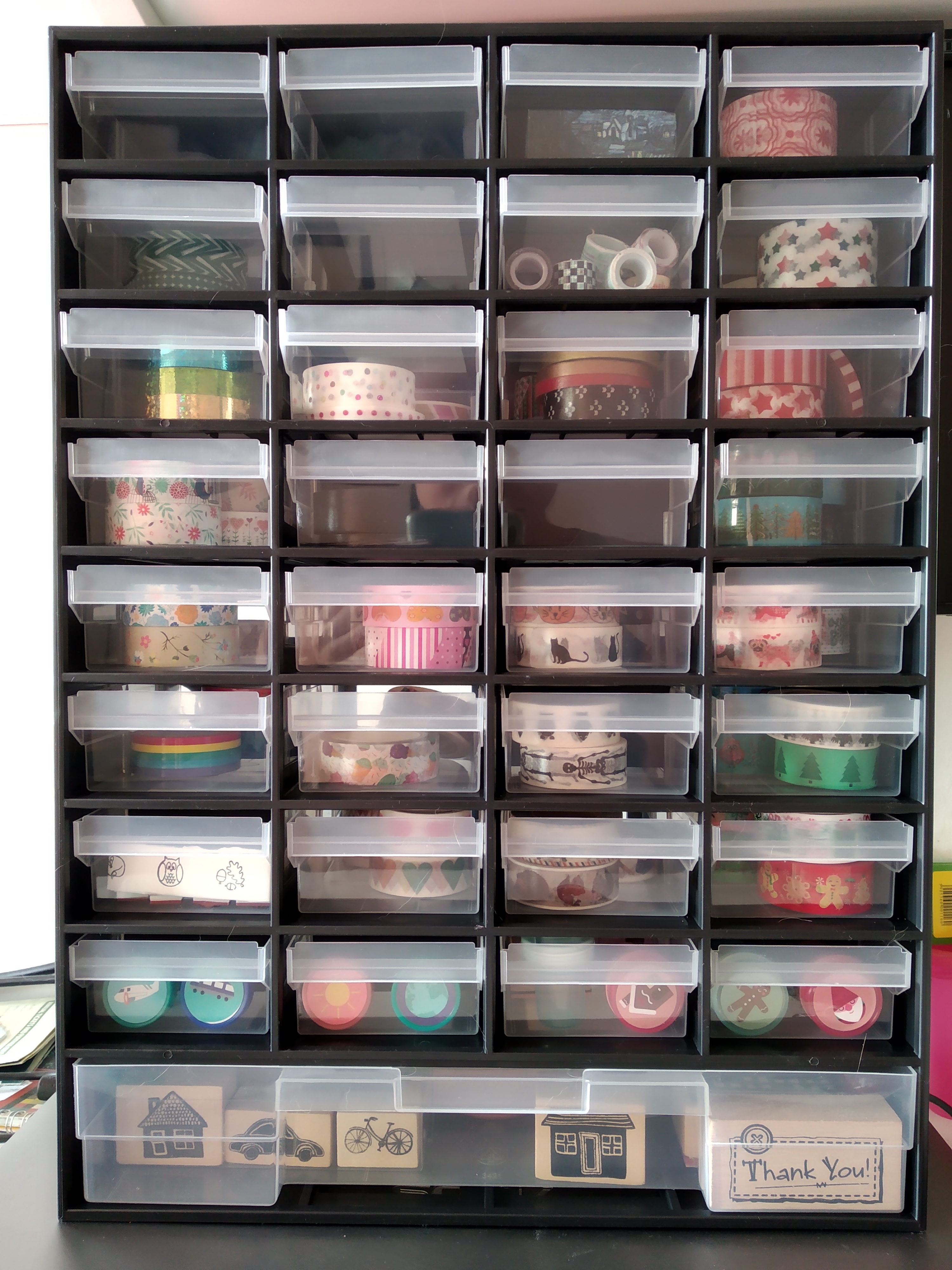 - takie wspaniałe szufladki są obecnie w Lidlu, zmieściły mi się wszystkie taśmy klejące i stempelki :)