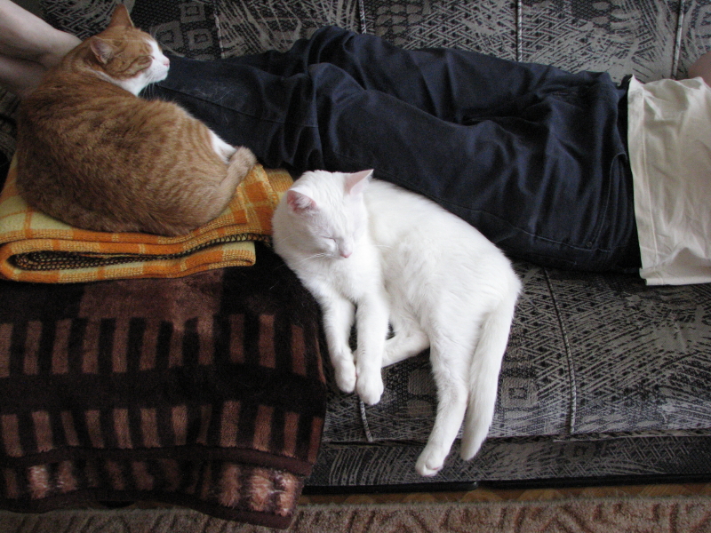 [^dzierzba] Widzę, że dziś w nocy kotki nie próżnowały. A #taniedranie były wyjątkowo spokojne, kiedy wstałam, leżeli przytuleni na kanapie w drugim pokoju.