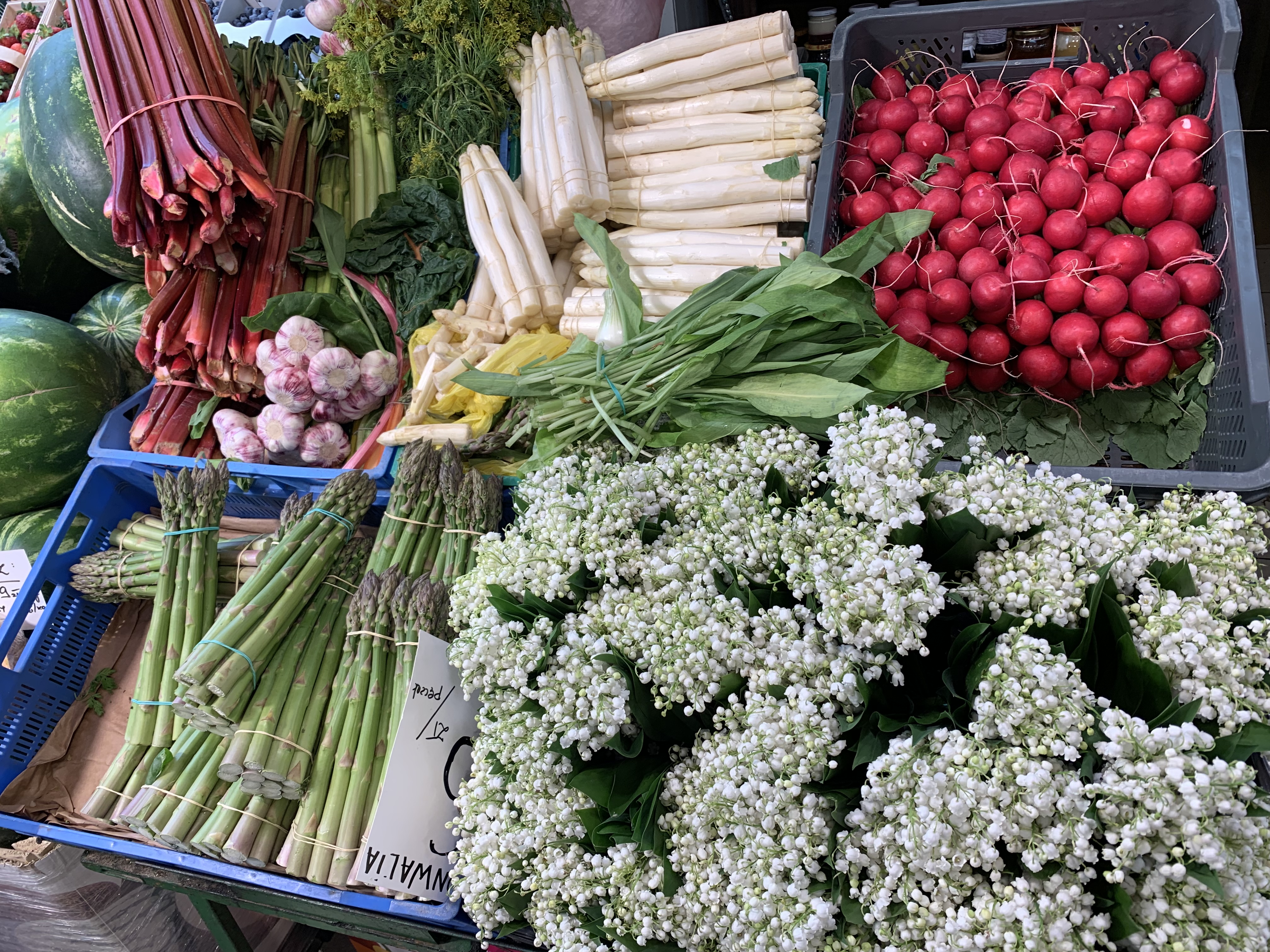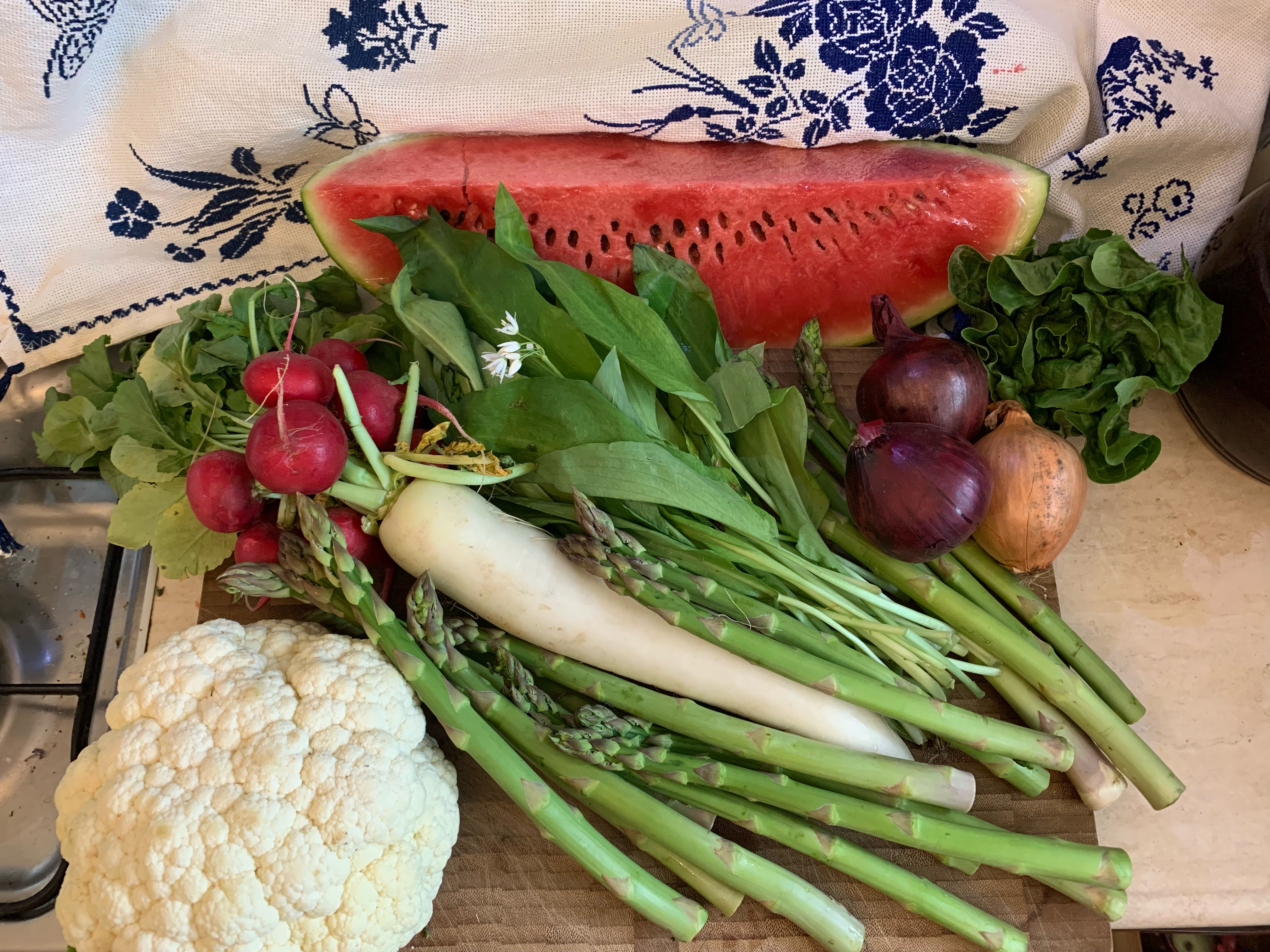 jakie bogactwo! czosnek niedźwiedzi, rzodkiewki, szparagi, kalafior, arbuz, sałata rzymska, cebule białe i czerwone #