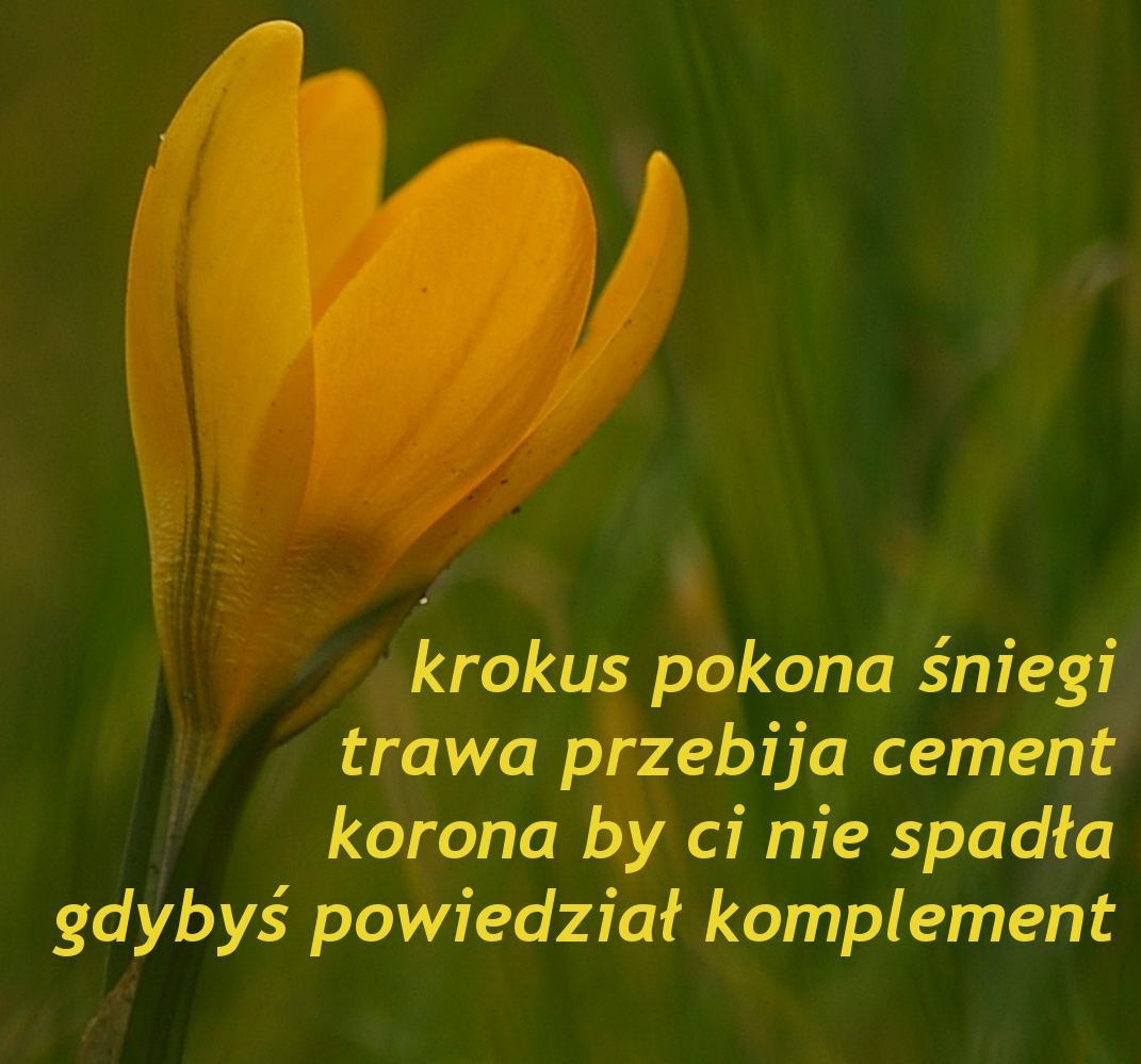 krokusy żółte i fioletowe / a przebiśniegi zielono-białe / ja Ci to wszystko już dziś pokazałam / czy ty mnie chuju w ogóle słuchałeś? #zuapoezja #kurwa