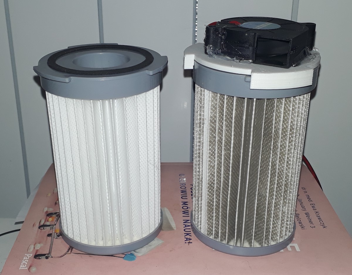 bashfullsson: Filtr HEPA od odkurzacza. Wiatraczek odśrodkowy 12V pędzony 5V z USB. Po lewej czysty filtr dla porównania. enżinerink. |