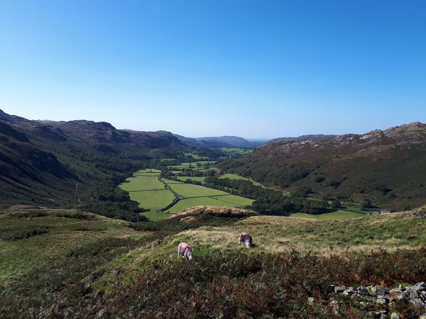 boni01: [^boni01] Widok na zach. w dolinę w stronę Ravenglass, forcik Hardknott strzegł drogi wsch-zach przez górki obecnego Lakes; w Ravenglass był "prawdziwy" obóz rzymski, zostały ogryzki łaźni, za to na 4m wysokie #bofoto kartoflem |