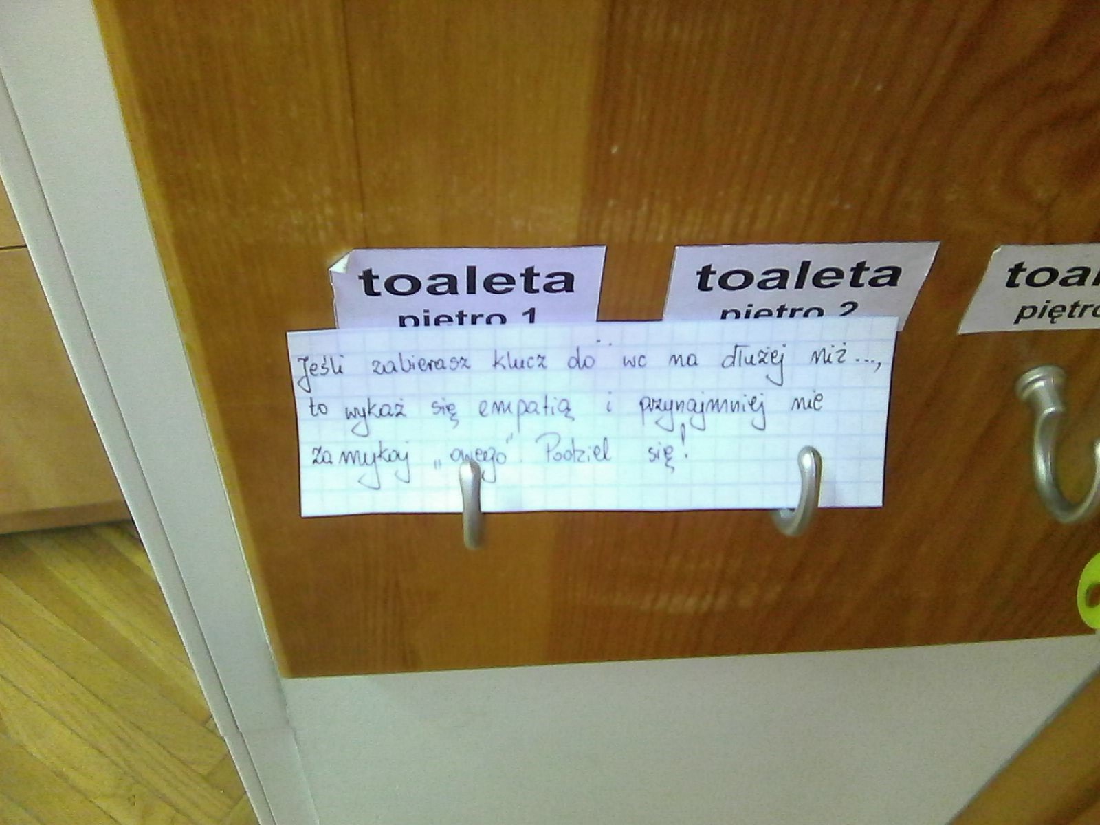 deli: [^rmikke] Toalety nauczycielskiej. Na klucz. Jak widać ktoś nie chciał powtarzać słowa WC. |